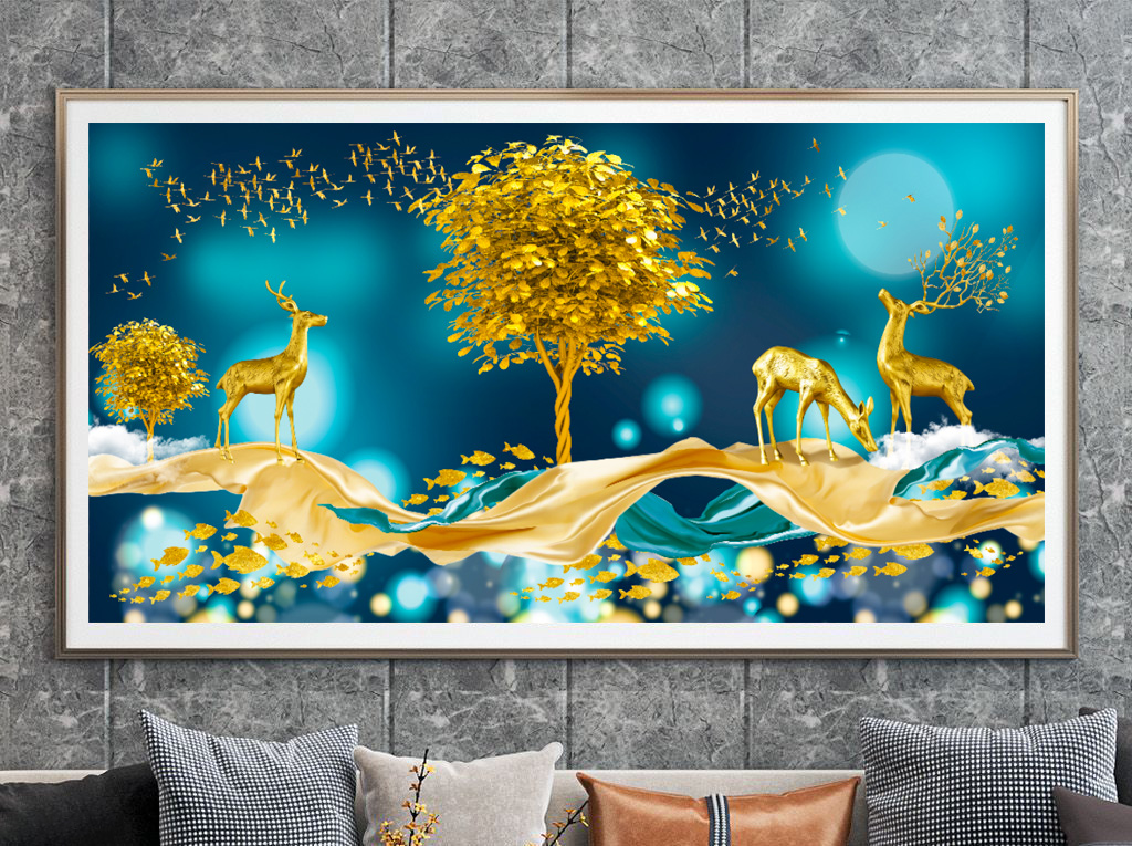 Tranh Treo Tường Phong Cảnh Hươu Tài Lộc Và Cây Vàng Treo Phòng Khách TL22